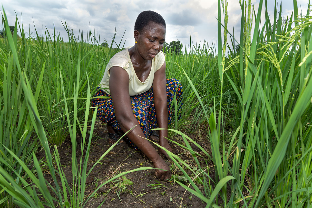 Adrekpe is standing barefoot in the field, his feet chapped. Using his machete he slashes right into a shrub that has put down roots amid the rice. It’s plain to see how difficult the 56-year-old finds crouching for hours at a time and working bent over. Ameganvi, too, has a few beads of sweat on her face. ‘But I love the plants and working in the fields,’ says the rice grower. ‘When I see how my plants are thriving, it gives me renewed energy.’