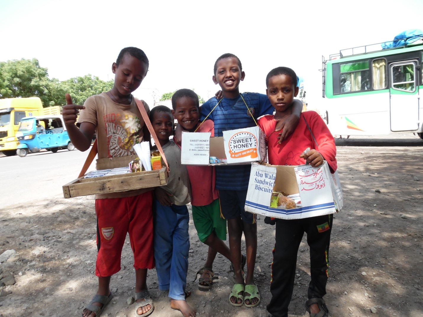 Children are selling biscuits and chewing gums on the street to passing-by travelers when breaking for breakfast and lunch. Photo: Essa C. Mussa