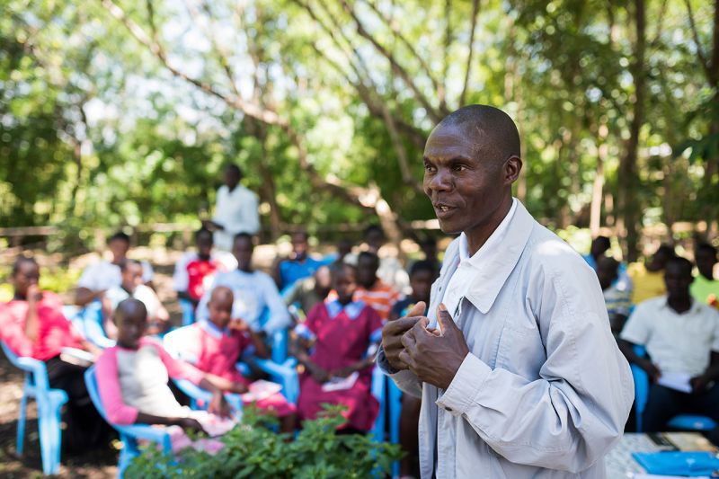 After a drought threw him back during the year, he sold a cow, bought material and dug the first rain collection tank with his sons. World Vision employees watched his efforts and then advised him every step of the way on how he could take further measures: He organised his farm, created irrigation ditches, planted trees, and learned how to grow vegetables. The key component remained the nursery however. "The project has enabled me to set up a modern, larger nursery where I can now grow 30,000 seedlings at the same time", says Odwaro proudly. His fruit trees are particularly highly sought after, because "fruit is a luxury in this area, and many families cannot afford to buy it regularly for their children". Through the BMZ project, he has provided several schools with seedlings for orchards, including the neighbouring elementary school, and initiated natural regeneration plots in schools. He is now working there as a mentor for environmental education. At the same time, more and more people in the region became interested in native deciduous trees, because the education campaigns on the benefits of agroforestry were effective.