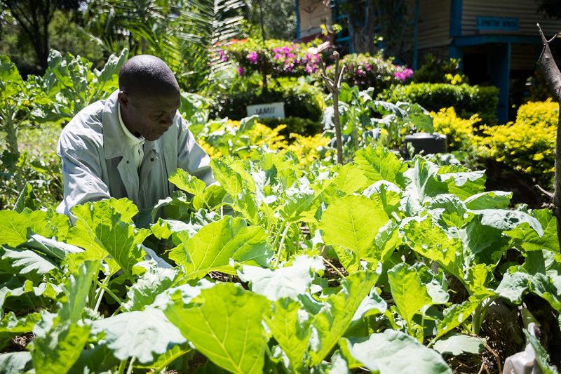 Rafael Odwaro and his wife Sophia only have to walk a few steps out of their house and they are standing in the middle of their Garden of Eden. Red, purple and yellow flowers bloom alongside herbs, spinach and wild vegetables. Aloe vera grows between protective hedges and climbing herbs, as do banana plants and mango and orange trees. Butterflies fly around, as if they could hardly decide where to snack first. Small, silver fish are circling in a pond. The garden is adjoined to a shady square with compost heaps and a cowshed enclosure. Deciduous trees hide the view of a greenhouse, another enclosure for dairy goats and the lower-lying fields, where sweet potatoes, groundnuts and chickpeas, as well as fodder crops for the animals, grow under papaya trees.