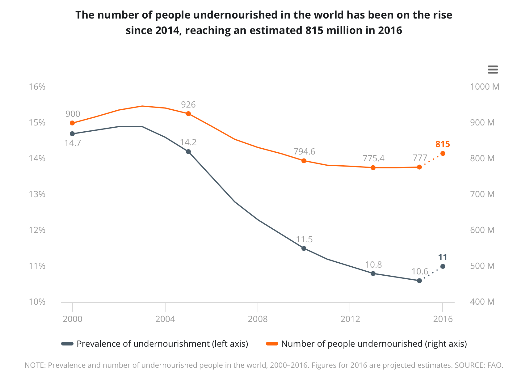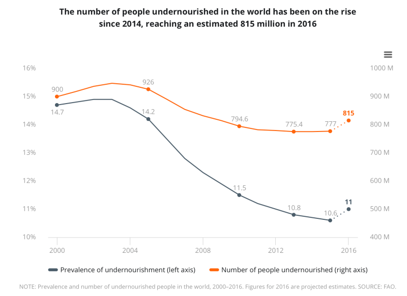 According to "The State of Food Security and Nutrition 2017", the number of starving people worldwide has been rising again since 2014. While there were around 900 million people starving in 2000, the number had fallen to 775 million in 2013, and has since risen to 815 million. The percentage of starving people in the total population also fell from 14.7 per cent in 2000 to 10.6 per cent in 2015, but has since risen again slightly. In sub-Saharan Africa, the absolute number of starving people has increased from 178 million in 2000 to 224 million in 2016.