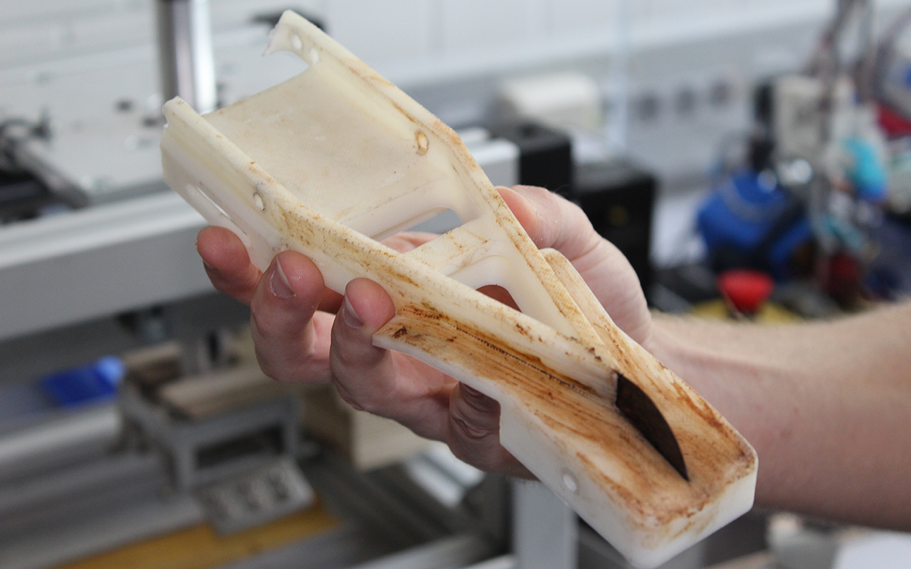 Two possible models have won out: the first model is placed on the ground and operated with a lever. It has a magazine which can hold multiple pods, and can peel a single pod in just 5.6 seconds. The second model, on the other hand, is attached to a tree. While this method is somewhat slower than the first, with a maximum speed of 7.7 seconds, it requires less power and, purely theoretically, could also be extended with a magazine. The centerpiece of both designs is a wedge knife which the students designed themselves using a 3D printer. This allows the machine to cut open cocoa pods without splitting them completely or damaging the valuable beans.