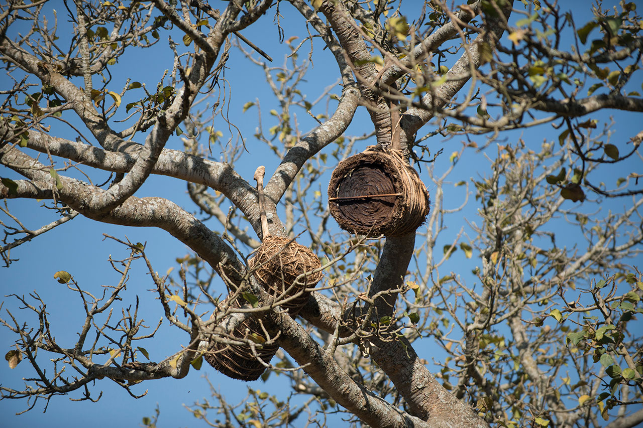 Dann beginnt der schwierigste – und riskanteste – Part: „Wir leeren die Röhre auf einer Plane aus und hindern die Bienen mit einem künstlichen Sprühregen am Wegfliegen.“ Nun folgt die Suche nach der Königin, die irgendwo in dem schwarzen Insektenhaufen versteckt ist. „Die Arbeiterinnen schützen die Königin, das macht es so schwer sie zu finden.“ Ist sie aber erst einmal in der Hand des Imkers, geht es ganz schnell: Die Königin wird in einen der Bienenkästen gebracht, woraufhin die anderen Bienen ihr automatisch folgen. Künstliche Waben aus Wachs, die Mekonnen und die anderen in Handarbeit hergestellt haben, bieten den Tieren im Inneren des Kastens ein angenehmes neues zu Hause. Das Volk zieht ein.