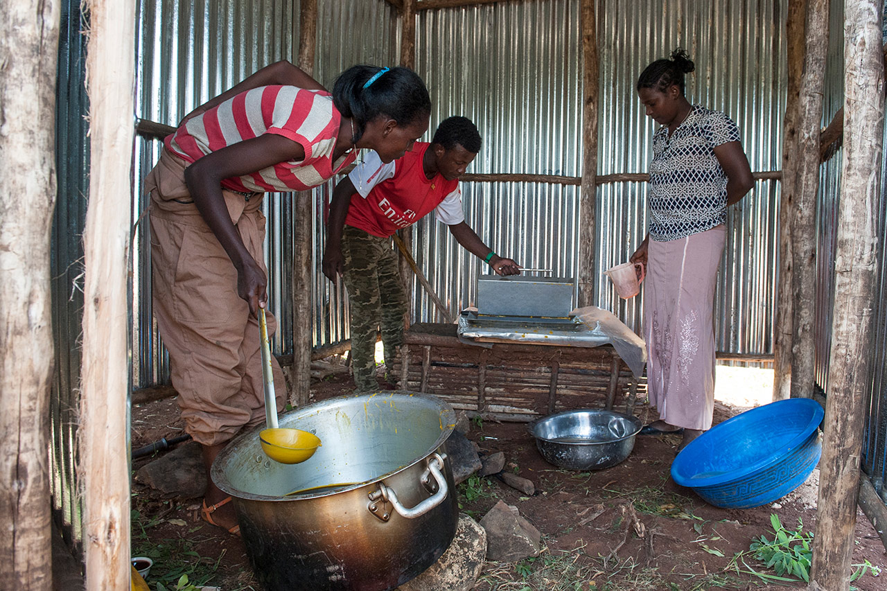 „Pro Bienenkasten können wir mit rund sechzig Kilo Honig im Jahr rechnen“, sagt Adane Mekonnen. Macht bei fünfzig Kästen rund 3.000 Kilo. Ein Kilo dieses hochwertigen Honigs erzielt in Äthiopien Preise von bis zu hundert Birr, umgerechnet rund drei Euro. Die junge Imker-Kooperative verkauft ihren Honig jedoch nicht an große Firmen. Ihr Abnehmer ist eine weitere von Menschen für Menschen gegründete Gruppe, die den Honig reinigt. Im Anschluss wird der gereinigte Honig an eine weitere Kooperative weitergereicht, die ihn in Gläser abfüllt, diese etikettiert und verpackt. Anschließend übernimmt eine vierte Gruppe junger Leute den Transport zu Märkten und Großhändlern in der Region, aber auch in der Hauptstadt Addis Abeba. Die somit errichtete Wertschöpfungskette gibt rund sechzig Jugendlichen Arbeit. „Das Geld, das wir auf diese Weise verdienen können, gibt uns Sicherheit“, sagt Adane Mekonnen. Aber nicht nur das: „Die Arbeit hat uns unseren Stolz und unsere Hoffnung zurückgegeben.“