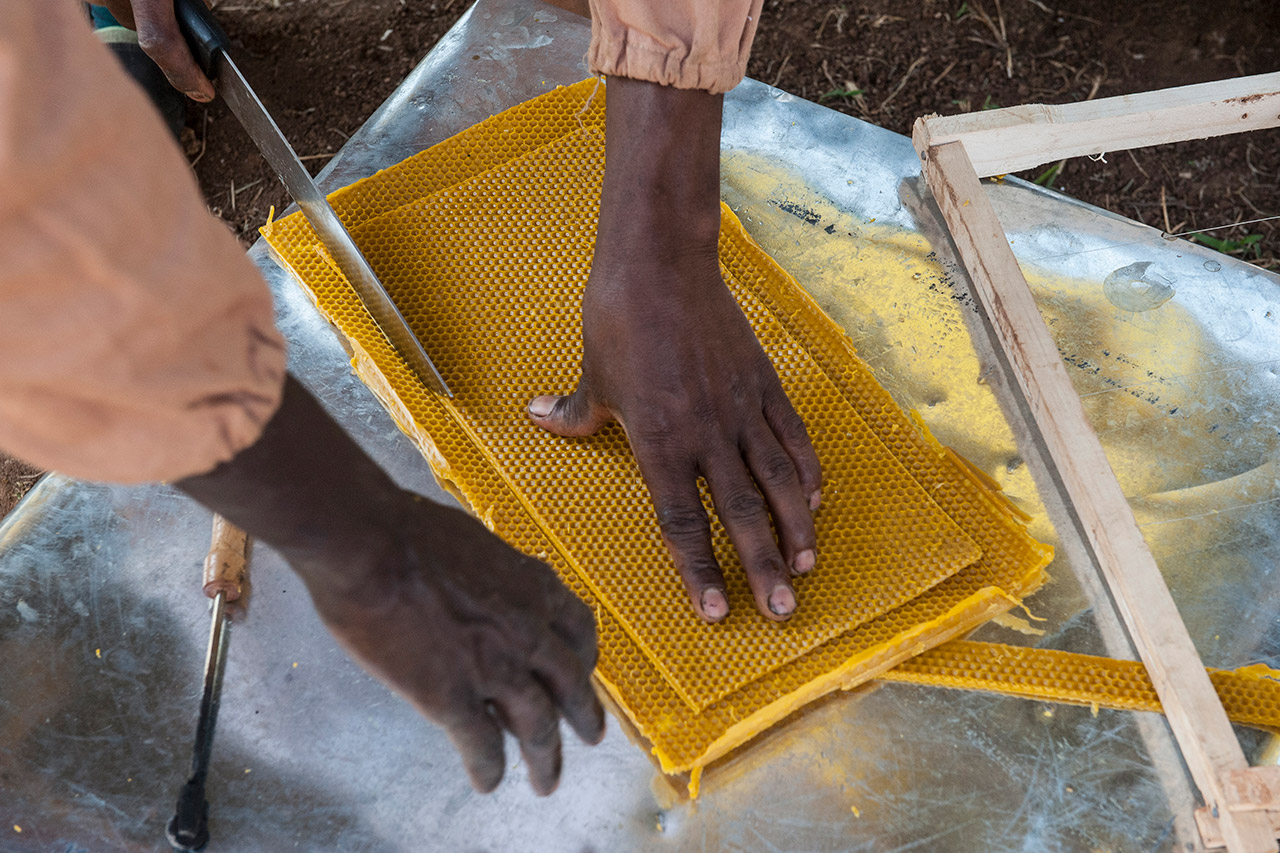 Im Bienenhaus von Adane Mekonnen und den anderen sind zwar erst in 25 der 50 gelben Kästen Bienenvölker zu Hause, doch die jungen Leute arbeiten fieberhaft daran, auch die übrigen Boxen mit Leben – und tierischer Arbeitskraft – zu füllen. Dazu zimmern sie schmale hölzerne Röhren und hängen sie in Bäumen in der Gegend auf. Der Duft des Rauchs, mit dem sie die Röhren zuvor behandelt haben, lockt wilde Bienen, die auf der Suche nach einer neuen Heimat sind, an. „Wenn sie sich eingenistet haben, muss jemand da hoch und die Röhre herunterholen“, sagt der drahtige Mekonnen. Nicht er ist es, der diesen Job übernehmen muss.